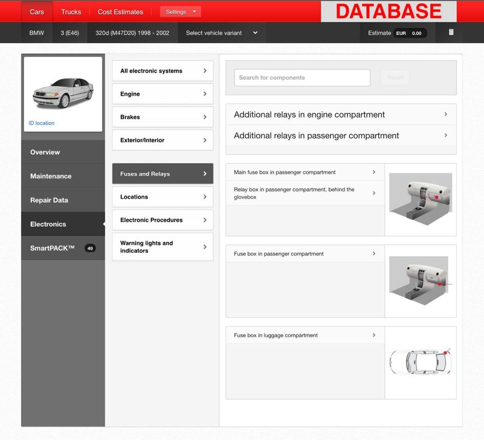 • Database provides wiring diagrams, repair data and procedures, adjustment data, repair times, recall information, TSB (Technical Service Bulletins), real diagnostic cases, and complete fuses and relays diagrams for a wide range of vehicles. The system is 100% online and web-based, with no software download or installation required.